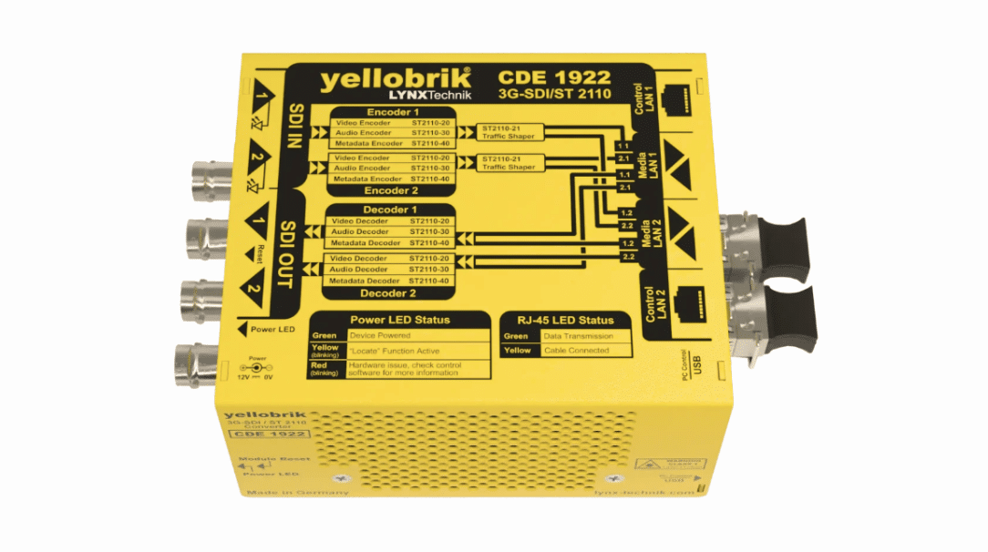 The CDE 1922 enables bidirectional 3G-SDI ↔ IP ST 2110 conversion for up to four HD streams. It features 2 audio encoders and 2 decoders (ST2110-30, 8 channels each), full IP redundancy (ST 2022-7), and NMOS support for easy network management. A modern web interface and yelloGUI / LynxCentraal compatibility ensure effortless remote monitoring and control.