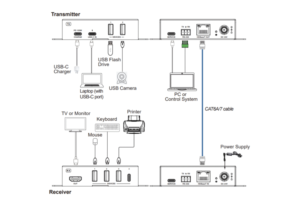 Using a simple CAT6A/7 network cable, the system simultaneously carries uncompressed 4K60 video, multi-channel audio, and USB data. Transmission remains stable, smooth, and without noticeable latency, even at 70 meters.