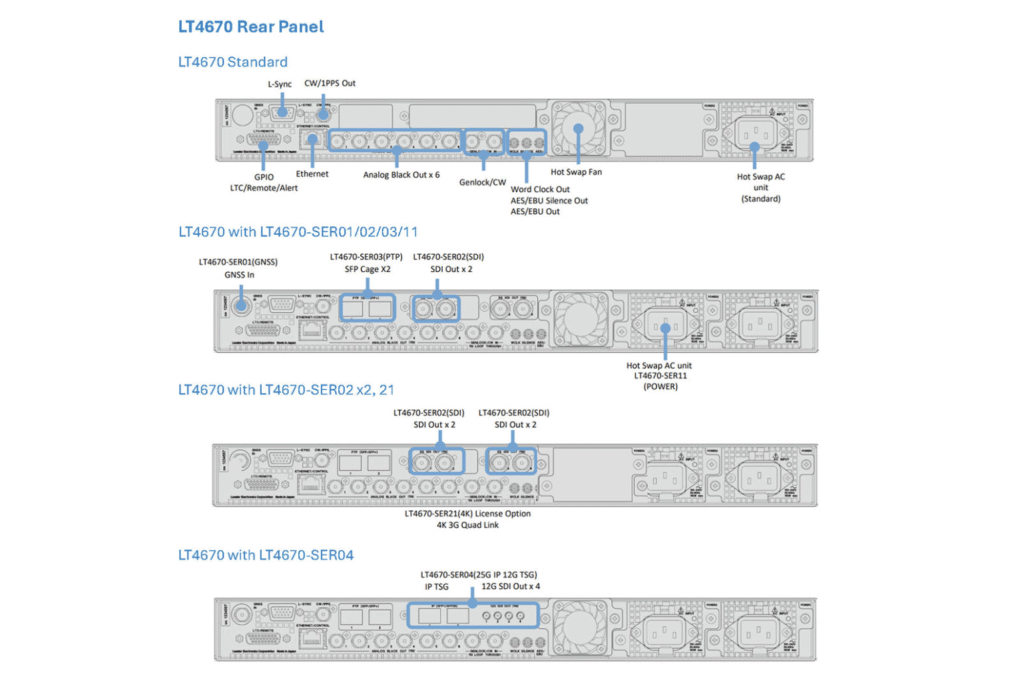 Highly configurable, the LT4670 can be customized with optional modules including GNSS sync, 4K/HD IP output, 4K 12G-SDI, and more—making it a powerful tool for managing synchronization across a wide variety of system architectures.